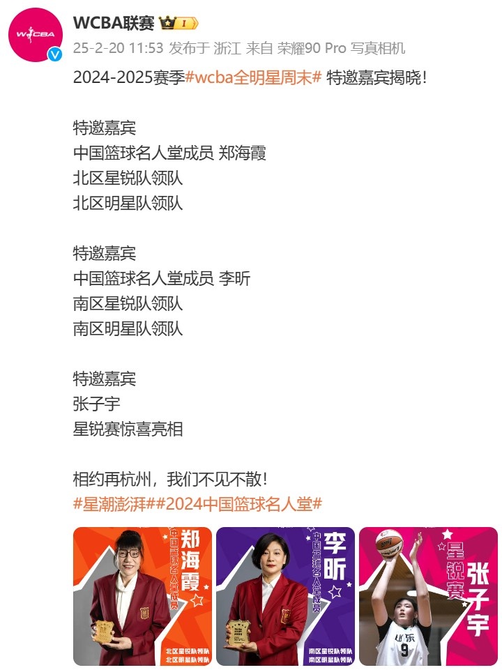 天涯直播2月20日讯 本周末,本赛季的WCBA全明星赛将会在杭州黄龙体育中心举行。 WCBA联赛官方微博发文公布了三位特邀嘉宾,分别是郑海霞、李昕和张子宇,原文如下: